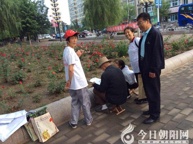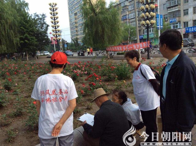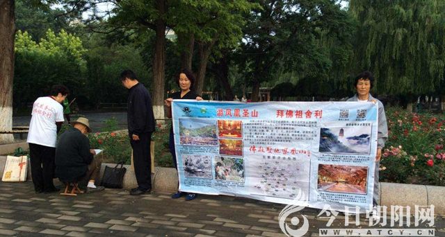2015年6月13日,一場(chǎng)急雨過(guò)后,遼寧朝陽(yáng)人民公園的空氣更加清新,風(fēng)景愈發(fā)秀美。幾位來(lái)自朝陽(yáng)市老年書畫家鳳凰山旅游服務(wù)隊(duì)的老同志,抬著宣傳板走進(jìn)公園,積極向市民義務(wù)宣傳鳳凰山。