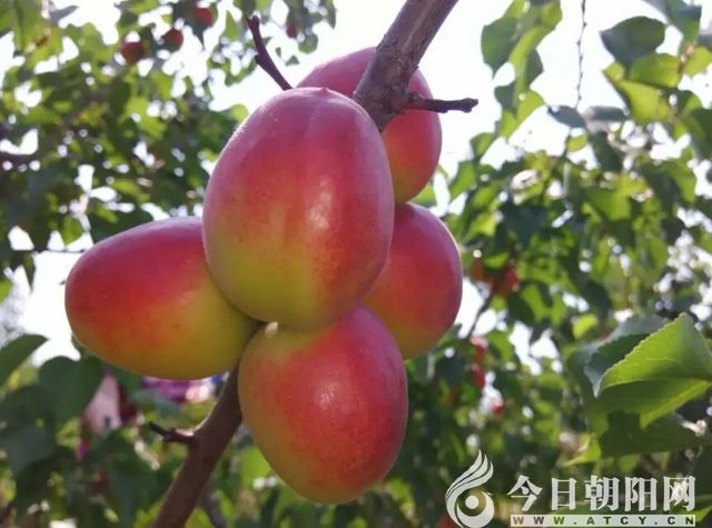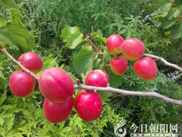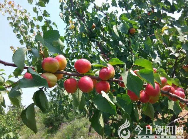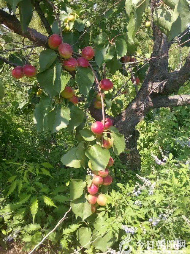 杏府生態(tài)園如今已經(jīng)建起了農(nóng)業(yè)合作社,遠遠望見“立豐合作社”的牌匾在陽光下愈加醒目。 一行人迫不可待地下車,沿著爬滿葡萄藤蔓的長廊快步往上走,“123蘋果園”、“桑果園”、“桃園”、“文冠果園”,一片生機。最多的還是面積約100畝、擁有各種嫁接新品種的杏樹園,都是聘請果樹專家引進食用杏樹種在山杏樹上嫁接而成的,有金太陽杏、麥黃杏和大紅袍杏等各種杏樹近6000棵。 眼下正是采摘杏果的時節(jié),坡上坡下滿樹大大小小的串串杏果,吸引著眾人的眼球。
