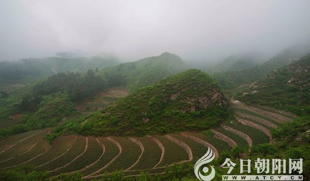盛情難卻。我們坐在曾經(jīng)熟悉不過的熱乎乎的土炕上吃過農(nóng)家飯,便在曲振生老人的兒子曲大哥的帶領(lǐng)下,前往八盤溝的南天門溝。走出八盤溝村,我們踏上一條鋪滿石子的山路,路旁就是一層層的梯田,綿延到雨后薄薄的云霧繚繞的大山高處,讓我們初去八盤溝的五位同行者不時發(fā)出嘖嘖驚嘆,此情此景,一首兒時父母總在我的耳邊哼唱的“一座座青山緊相連,一朵朵白云繞山間,一片片梯田一層層綠,一陣陣歌聲隨風(fēng)傳......”的歌兒悄然在我心中唱響,這首歌分明就是唱給八盤溝的。此時的八盤溝,雨后的霧和天空的白云連在一起,在峰巒疊嶂之間時聚時散,時淡時濃,自如灑脫;一層層梯田上種植的玉米、高粱、谷黍、向日癸、大蔥等多種農(nóng)作物,呈現(xiàn)出一派豐收的景象。然而最巧合的是,進(jìn)溝不遠(yuǎn),便現(xiàn)一幢很舊的樓房。曲大哥說,這里曾駐扎過部隊,近幾年才搬走。于是我的眼前又一次出現(xiàn)兒時為修大寨田給“解放軍叔叔”送茶水的情景。