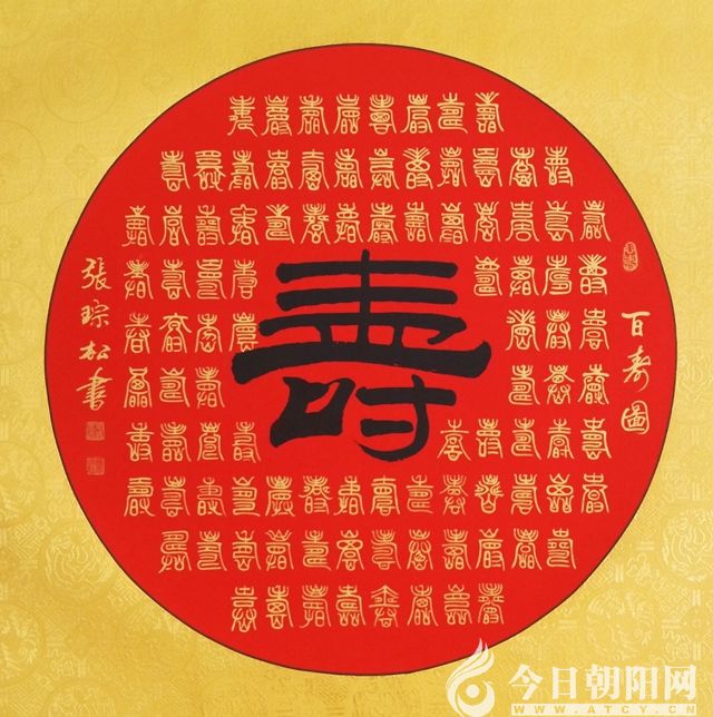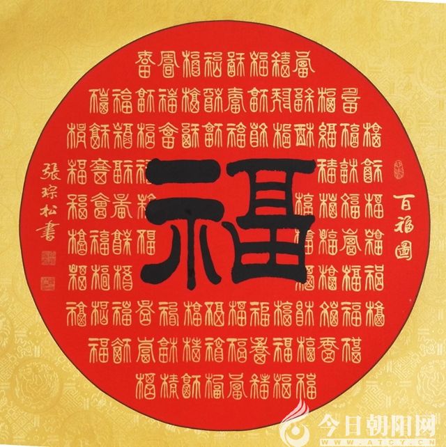 縱觀張琮松的金粉隸書和篆書,除去他經(jīng)典的隸書《心經(jīng)》、《大悲咒》、《金剛經(jīng)》、《華嚴(yán)經(jīng)》、《道德經(jīng)》等經(jīng)文之外,金粉隸書《出師表》、《陋室銘》和金粉篆書《百福圖》、《百壽圖》、《般若波羅蜜多心經(jīng)》等作品也堪稱當(dāng)世經(jīng)典之作。作者在創(chuàng)作過程中更多的是承襲了中國書法的文脈,他在傳統(tǒng)素書的基礎(chǔ)上用現(xiàn)代審美意識豐富、完善了書法藝術(shù)的創(chuàng)作手段,改墨汁為金粉,改白宣為藏藍(lán)或大紅。在這些細(xì)微的變化中,不僅寫出了視覺的沖擊,更重要的是寫出了書家所思所想,為其作品注入了寬博的哲學(xué)內(nèi)涵。在創(chuàng)作過程中,張琮松通過抽象的筆墨線條來抒發(fā)主觀情懷。特別是在《出師表》一文中,作者通過字體結(jié)構(gòu)的變化和線條的飛揚,突出了諸葛亮親賢遠(yuǎn)佞的忠心激情,令人慷慨沉思,動人心魄。在《陋室銘》一文中,作者借物喻理、托物抒情。其筆墨線條安貧樂道,以靜為動,用筆老辣,高雅脫俗,可與廟堂經(jīng)典相媲美,真正恪守了他“出于法而守于道”的創(chuàng)作原則。他將儒家道統(tǒng),釋家超脫與道家物化寄情于筆墨之中,這又何嘗不是書家的心靈告白和情感寄托呢?