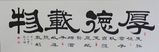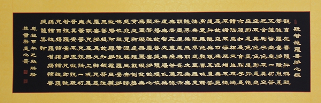 他認(rèn)為,書法就是心靈的寫照,心不正則書不正。他在書法創(chuàng)作和經(jīng)文抄錄中,總會以一顆平常心去解讀頓悟字句的內(nèi)涵,理性架構(gòu)作品布局,詮釋傳統(tǒng)書藝精髓。他的書法作品線條嚴(yán)肅而不拘泥,轉(zhuǎn)折靈動而不張揚,布局勻稱而不呆板,筆墨圓潤而不臃腫,其一橫一豎皆見佛理,一撇一捺皆有禪趣。譬如他的經(jīng)典金粉隸書作品《般若波羅蜜多心經(jīng)》和《金剛經(jīng)》,其書風(fēng)穩(wěn)健勻凈,溫溫和雅,寬博大度。他的用筆均勻順暢,橫筆勻長,豎筆簡短,波畫明晰,撇捺內(nèi)斂,張弛有度,蠶頭燕尾樸茂厚重;其字結(jié)構(gòu)緊湊,字字勻稱,線條溫潤光滑,勁健骨感。他的經(jīng)文作品拒絕飛白,結(jié)字和章法布白也極為均勻滿實,處處彰顯《曹全碑》、《乙瑛碑》氣韻秀麗,正中寓欹,平和簡靜的印痕。