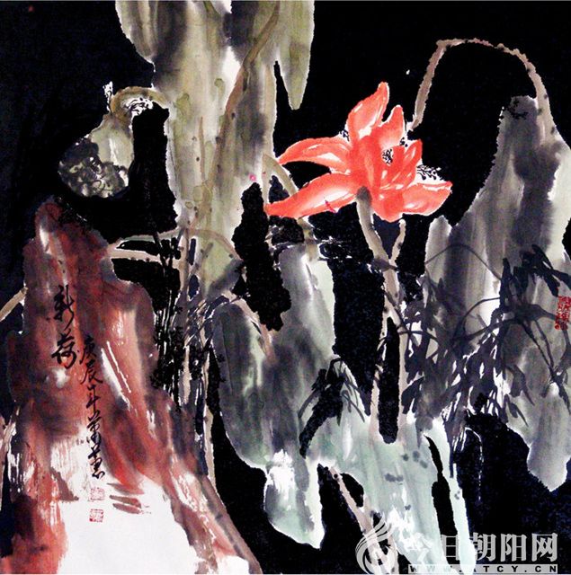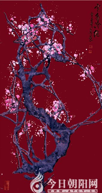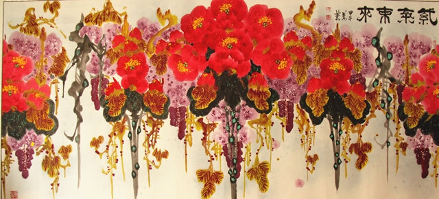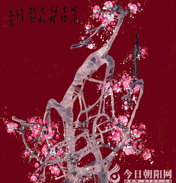 江頭千樹斜更好,一夜乾坤萬(wàn)里春。蕭蕙平素喜歡荷花,卻擅畫梅花、牡丹。她在熟宣上首創(chuàng)了“凝骨畫梅”新技法,將梅花的冰清玉潔、凌風(fēng)傲雪表現(xiàn)得淋漓盡致,令人耳目一新。她認(rèn)為,畫梅不能只追求曲美,應(yīng)重在精神,畫作要表現(xiàn)出梅花寧折不彎的神韻,要畫出傲骨。她的《寒香冷艷》作品,其構(gòu)圖立意,用筆著色,別有新意。梅花枝節(jié)凝冰結(jié)凍,寒氣逼人,散落期間的梅花,如繁星點(diǎn)點(diǎn),配置于暗紅色背景,更加襯托出了寒香冷艷的梅花精神,給讀者一種全新的視覺(jué)空間和錚錚鐵骨傲立寒冬的形象。而《乾坤萬(wàn)里春》這幅作品更是氣勢(shì)恢宏,鐵骨傲雪,幽香絕塵。該作品深深打動(dòng)了此前對(duì)中國(guó)畫毫無(wú)感覺(jué)的美國(guó)世界銀行友人,并被其收藏。畫梅大師于希寧老先生看到這幅作品后,激動(dòng)地說(shuō):“這哪里像女同志畫的?男同志也沒(méi)畫出你這種氣魄。”并題詞曰:“理乃意之本,筆為意渡津,以文導(dǎo)繪意,斯意可通神。”牡丹不僅是花中之王,且高貴典雅而又雍容華貴。因此,畫家蕭蕙對(duì)牡丹別有一種情愫,為了抒發(fā)內(nèi)心感悟,往往喜歡采用大寫意的藝術(shù)手法,把繁花朵朵,凝造為落紅片片。她牢記齊白石大師的教導(dǎo),“作畫太似為媚俗,不似為欺世,當(dāng)妙在似與不似之間耳”!這也正是蕭蕙的藝術(shù)追求?!蹲蠚鈻|來(lái)》是一幅體現(xiàn)畫家創(chuàng)新意識(shí)和才華橫溢的代表作。以“萬(wàn)紫千紅總是春”的意象化的象征意義表現(xiàn)出神州大地的春意盎然,蒸蒸日上,整幅畫面充滿祥瑞之氣,花團(tuán)錦簇斑斕雜陳,一派蓬勃壯觀的氣勢(shì),使牡丹在妖艷中透著高貴和典雅,給人以強(qiáng)烈的視覺(jué)沖擊。
