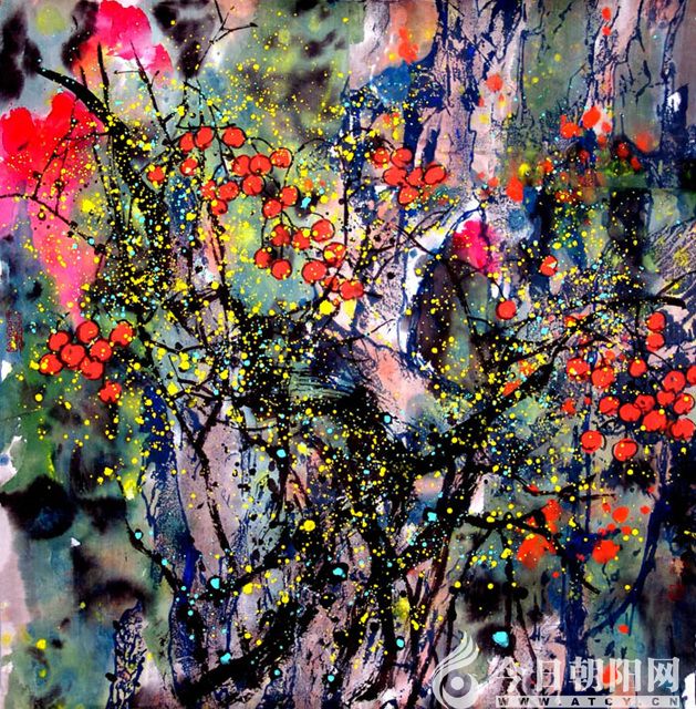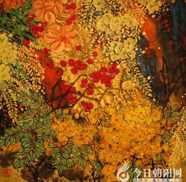 蕭蕙的花鳥畫已經(jīng)突破傳統(tǒng)花鳥畫的筆墨技法,不是人們常見的具象的花鳥,而是一種感覺(jué)。這是一種境界,一種狀態(tài)。她已經(jīng)把眼光放大了,不再為一花一枝精雕細(xì)琢了。她用色彩豐富了人們的感官,她是精神的,是情感的,是思想的。藝術(shù)的感悟和人生的歷練,全憑那一縷墨緒和一種筆趣了,這是畫家筆墨的個(gè)性。如她的《藍(lán)色奏鳴曲》配詩(shī):藍(lán)色青山藍(lán)色夢(mèng)/藍(lán)色曲調(diào)藍(lán)色風(fēng)/吟詩(shī)入夢(mèng)情幾許/感慨無(wú)限心底生。再如《春花秋實(shí)》配詩(shī):春煙如織花如潮/醉香遍野子滿坳/待到碩果滿枝架/金秋唱晚度良宵。蕭蕙的這些作品情凝筆端,冷艷心田。我們不能簡(jiǎn)單用傳統(tǒng)繪畫審美標(biāo)準(zhǔn)來(lái)考量,必須從色彩涌動(dòng)中審視作品,從視覺(jué)沖擊和心靈震撼中尋找共鳴。正因?yàn)槭掁ツ鼙袀鹘y(tǒng),突破傳統(tǒng),與時(shí)俱進(jìn),在斑斕的色彩世界里重塑了一個(gè)嶄新的自我,才形成了她獨(dú)特的“中西合璧”式的繪畫風(fēng)格。她敢于用大片的紫紅色來(lái)渲染生動(dòng)燦爛的繁華,敢用大量藍(lán)色渲染山藤青翠,你很難分清花枝葉石,錯(cuò)綜復(fù)雜,豐富多彩,讓人對(duì)春色產(chǎn)生了夢(mèng)幻般的感覺(jué)。在紛繁中彰顯華貴、在平易中驚嘆高雅。她用藝術(shù)的靈感和嫻熟的技藝,揮灑出氣勢(shì)恢宏的大寫意畫面。她把在生活中撲捉到的頃刻間的美麗,揮毫潑墨躍然紙上,使短暫的美麗成為永恒的畫卷。