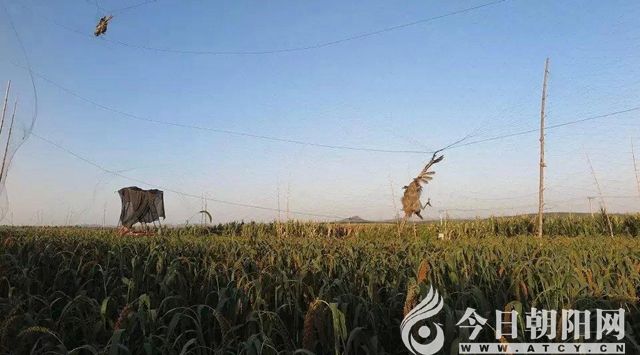 老爸在谷子地里立了很多根上端是十字形的桿子,把家里人不穿的破襖掛在桿子上,伸展成個人形,用來嚇唬麻雀。為了嚴防死守,谷子地兩頭釘了木橛子,來來回回用線繩拉上,幾乎是在谷子地上方布了一道網(wǎng),又在地中間隔三差五立根小細桿,把各色的方便袋撕成長條,飄飄搖搖拴在上面。這些都是相當于稻草人的勾當,麻雀狡猾得很,一開始還有點怕,后來似乎是看出了其中的端倪,便放肆起來,大膽起來,每每老爸到谷子地,嚷一聲,立刻飛起一群麻雀。這還得了,老爸開始想別的辦法趕走麻雀。他在谷子地外圍撒浸了農(nóng)藥的高粱粒,買了好多片粘網(wǎng)布在地頭、地中間,兜里裝了小鞭兒、雙響,時不時放上一個來他個冷不防,做了彈弓拿在手里,找個土坷垃發(fā)射出去,一片土粒散落在谷子地里,搞他個突然襲擊......凡是能想到的辦法,老爸都用了,但是效果也不是很好,因為四外的莊稼都死了,老爸這塊豐收的谷子地,成了鳥兒們的眾矢之的。