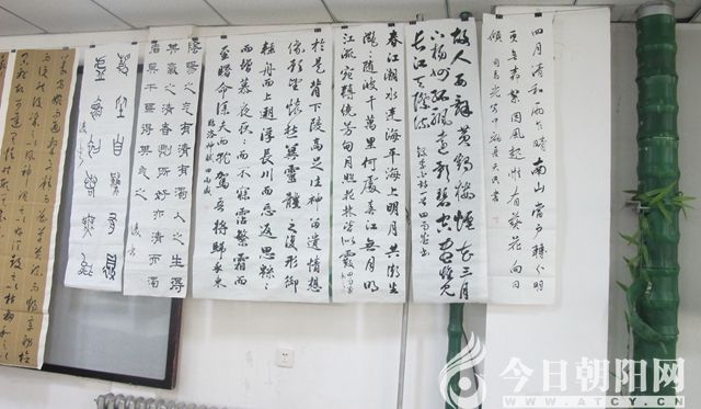 除了花香和書香,校園里還有濃重的墨香,走進(jìn)那間偌大的閱覽室,會(huì)被鋪天蓋地的書法作品所淹沒,這大屋子的四面墻上全都是各種筆體的書法作品,楷書、草書、隸書、篆體等各具風(fēng)格,作者多為省內(nèi)或市內(nèi)書法名家,書法作品楹聯(lián)居多數(shù)。而被譽(yù)為鎮(zhèn)館之寶的作品是王秉德和李煥新兩位老先生合作的《趙尚志賦》,這個(gè)巨幅的書法作品被掩在其他作品的下面,像一件不肯輕易示人的寶貝,蘊(yùn)藏著主人內(nèi)心無(wú)限珍愛之情。