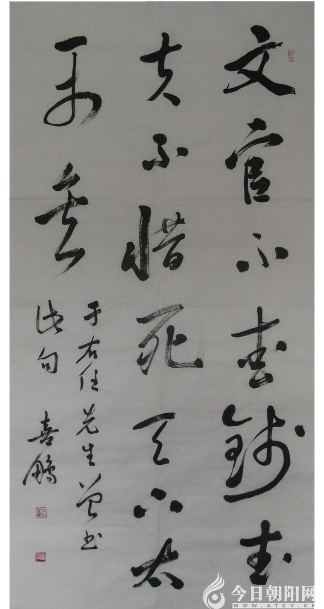 劉喜鵬2012年4月任朝陽縣史志辦主任,他讀書寫字的時間充裕了,在齊作聲、葛忠、孟慶冰、張玉、辛向民等老師的鞭策下,他重新執(zhí)起心愛的毛筆,開始了書法藝術新的征程。如今,與高手經常交流的劉喜鵬,書風、技藝有了新的進步。2009年,在市紀檢委舉辦的“廉政杯”書法作品展中,他的書法作品獲得優(yōu)秀作品獎;2012年參加了省書協(xié)舉辦的書展;2013年3月23日,在省市及凌源市書協(xié)組織的“沖擊國展”作品點評會上,他的作品專家們給予了較高的評價。