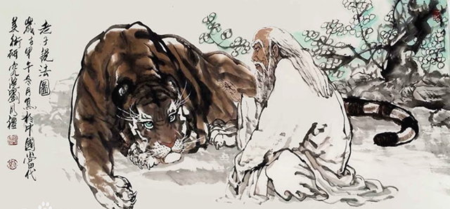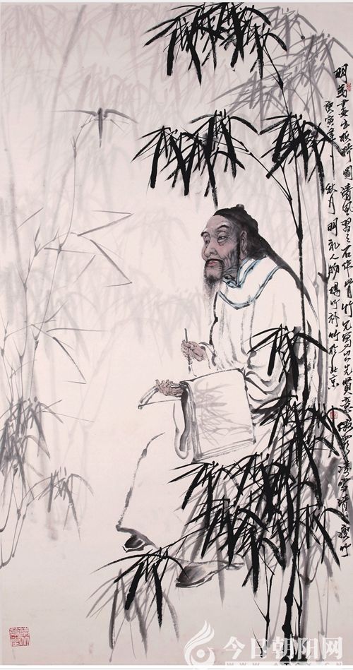 繪畫要傳達(dá)思想、情感,使繪畫富有意韻和神韻,必須有著特殊的寄托和象征,有著棲息心靈的感悟和升華。劉明禮的人物畫充分體現(xiàn)了他藝術(shù)天分、文學(xué)修養(yǎng)和仁愛、和諧、謙恭儒釋道哲學(xué)思想。他學(xué)習(xí)大師筆墨特色,又炯于大師創(chuàng)作技法,形成了自有的藝術(shù)創(chuàng)作風(fēng)格。他那汪洋肆意的筆墨造型,虛實相間的線條節(jié)奏,構(gòu)成了他人物畫創(chuàng)作的標(biāo)志性符號。觀看劉明禮的《順其自然》、《袖里乾坤》等我們不難發(fā)現(xiàn)他的藝術(shù)天分和智慧,他從八大山人、石濤、范曾等名家的畫作中看到了中國人文精神中所具有的突出特點(diǎn):簡遠(yuǎn)、參悟、虛實、天機(jī)……這些精神讓他如醉如癡,心追手摹。劉明禮的人物畫線條講究速度、節(jié)奏和虛實,柔和如春蠶吐絲,瘦勁像盤曲鐵線,流暢如流水行云?!俄樒渥匀弧?、《教子圖》、《袖里乾坤》這三幅作品最大特點(diǎn)是線條明快、用墨肆意,隨物賦形,以墨塊渲染架構(gòu)人物的肌理美,以書養(yǎng)畫。作品面部和雙手的刻畫讓讀者想到了范曾人物畫的線條運(yùn)用。范曾筆下勾畫人物的線條或是題款的運(yùn)筆都內(nèi)涵豐富、節(jié)奏感強(qiáng),富于變化、頓挫的線條,成為他書畫作品的典型特征。讀者從劉明禮的人物線條節(jié)奏中能體味到藝術(shù)家的書法功力、學(xué)識養(yǎng)成和審美修養(yǎng)。從作品人物墨色上剖析,劉明禮采用意象造型筆墨技法,水墨渲染,濃淡相間,質(zhì)感強(qiáng)烈。他的作品用色非常謹(jǐn)慎,一般只用墨色、紅色,兼用赭石,少許三綠,保持畫面單純、質(zhì)樸、高雅的色調(diào),形成了沖淡、簡約、靜寂、自然、含蓄的審美情趣,其作品在不經(jīng)意間一氣呵成。