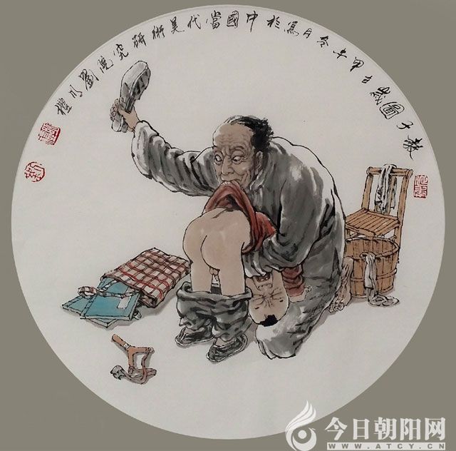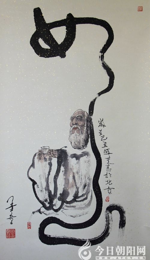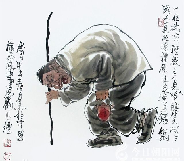 他創(chuàng)作的《三駝圖》既幽默又辛辣,觀后讓人浮想聯(lián)翩。畫面張駝、李駝、王駝三個老翁是三種不同形象,體現(xiàn)三種心態(tài),三人形象滑稽,笑態(tài)可掬。畫家以駝?wù)咧g的相互戲謔,來諷喻“世上無直人”。這幅96x178cm橫開作品藝術(shù)創(chuàng)作技巧跟明朝李世達(dá)《三駝圖》作品迥然不同(北京故宮博物院收藏),原作為豎軸,畫面簡潔,大面積留白,無襯景,三個人物衣紋用“渾描”,須發(fā)皆不見鉤勒痕跡,筆墨圓潤,柔若無骨。其上方有錢允治詩云:“張駝提盒去探親,李駝遇見問緣因;趙駝拍手呵呵笑,世上原來無直人。”劉明禮先生借用錢允治的詩詞老題新作,發(fā)揮自己筆墨特長,用線的語言以及書寫繪畫凝重分量,淋漓精致發(fā)揮著中國水墨畫的墨韻,通過點(diǎn)、線、面地勾勒,刻畫出了三個老翁不同心態(tài),畫面配以近竹、遠(yuǎn)山為襯景,錢允治的詩在畫面下半部,隨勢而書,靈動在三個駝?wù)咧g,烘托出天、地、人三為一體的蒼茫與凝重,把中國人物、山水、花鳥有機(jī)組合,繪成一幅蕩氣回腸,觸及靈魂凈土的珍品佳作。這幅作品較前輩大師們的作品畫面更飽滿,色彩更豐富,具象更生動,更富有視覺沖擊力,但又不失中國畫的含蓄和凝練,實現(xiàn)了超越人物表象的意趣與批判。他前幾年年夏季創(chuàng)作的《天天有當(dāng)上》作品,也是一幅借題發(fā)揮,警示貪婪者的批判現(xiàn)實主義佳作。整個畫面主體人物突出,造型逼真,靜動互補(bǔ),線條流暢,墨韻含蓄,虛實結(jié)合。其款與內(nèi)容相得益彰,把“天天有當(dāng)上,當(dāng)當(dāng)不一樣,不為太貪嘴,何必把命喪”這句詩在畫幅頂端“一字排開”,使整體畫面簡潔明快、渾然天成,讓人掩卷沉思。從這兩幅作品中我們可以洞察到劉明禮先生在秉承傳統(tǒng)文化的同時,又植入了新國畫創(chuàng)新元素,體現(xiàn)了一個人文畫家的批判現(xiàn)實主義的特征,反襯了中國文人關(guān)注社會、關(guān)注人生、憂國憂民的共性。
