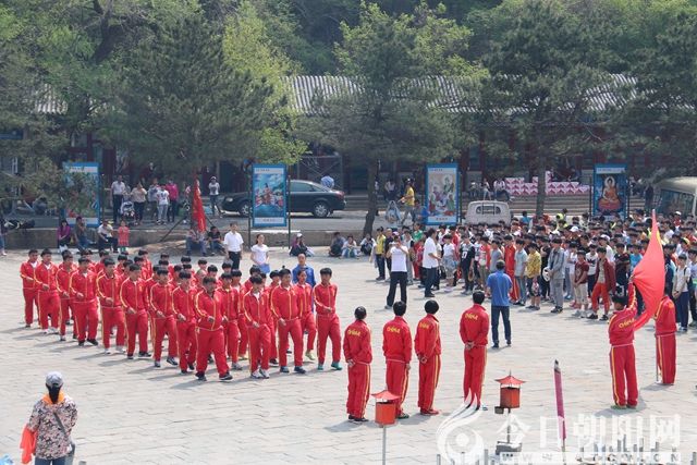 臨近正午,在鳳凰山下寺廣場,朝陽市體校的健將們整齊列隊于此。鮮紅的共青團旗迎風(fēng)飄揚,一批預(yù)備團員昂首挺胸,以這種徒步走的方式來到鳳凰山上,宣誓成為一名共青團員。