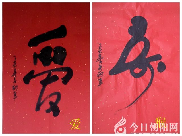 我們來看看王樹軍先生的作品《祥福》是怎樣將書畫奇妙地融為一體的。首先,這毋庸置疑地是一幅書法作品——“祥福”二字,“祥”字右面潑墨揮出,運斤成風,瀟灑狂放;左面卻又收放自如,點到即止;兩面共同組成了一個“華麗而不乏骨力,流美而不甜膩,瀟灑中見高雅,秀逸中見清奇”的“祥”字,頗具祥和、中庸之美。而“福”字,則是集中體現(xiàn)書畫一體的關鍵:因意造勢,隨物賦形,左面“示”字旁被刻畫成一個童子,右面“畐”字被描畫成一位母親,契合得體,神形獨到;而且童子呈拜年招財之態(tài),憨態(tài)可掬,母親呈賜福納財之狀,慈祥可親,二者共同組構成“福”字,妙趣橫生,意蘊無窮!一幅絕妙的書畫同體佳作橫空出世!于是,這幅作品擁有了多重寓意:1.享福的諧音;2.送財童子、仙姑賜福、吉祥有福的完美結合;3.母子深情。真真是境由心生,妙由天出,真虧了王樹軍先生想得出來!