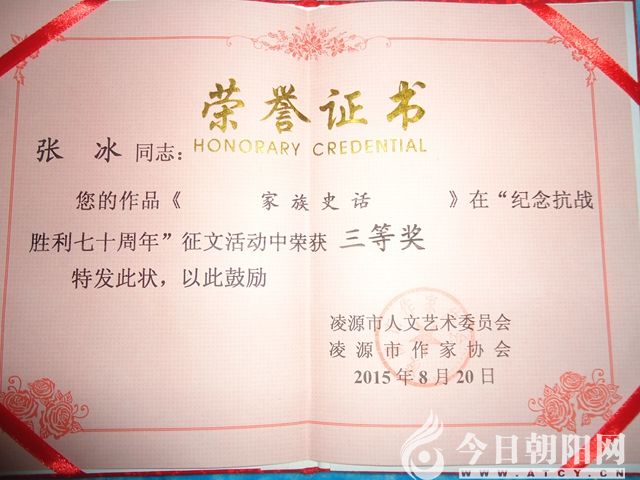 八月中旬,在“紀(jì)念抗戰(zhàn)勝利七十周年”征文活動(dòng)中,俺的抗戰(zhàn)題材散文【家族史話(huà)】獲得了三等獎(jiǎng)。