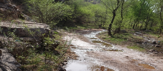 如此走走停停,約莫小半個(gè)時(shí)辰過去,一道胳膊肘彎拐過,眼前的溝壑蔥郁的植被忽然斷檔,溪流再不見一縷,干枯的河床空空蕩蕩,突兀的巨石橫七豎八地布著陣,緊貼山腳的沙石路一覽無余。人疑是轉(zhuǎn)瞬間從景色旖旎的江南,穿越到大漠孤煙的塞北,荒蕪、寂寥的氣息一股腦涌來,讓人生成莫大的心理落差,新奇中夾了幾分神秘,前方該是怎樣的一處村莊呢?