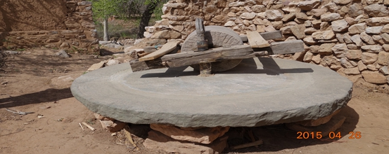 有村民勞作歸來,毛驢拖著的磙子與凹凸的路石咣咣當(dāng)當(dāng)碰撞著,奏響著大山里的天籟之音,單調(diào)卻生動(dòng)著。街上一群雞公雞母見怪不怪地騰挪幾下腳,閑適地低頭啄食不誤。一戶人家的院外,一架碾盤碾砣棄置在浮土廢石上,在風(fēng)塵里一點(diǎn)點(diǎn)寂寞地老去。向南不多遠(yuǎn),走上一段漫坡,先是一處五間房屋的廢墟,后山墻依舊完整,擋嚴(yán)了一處碾道。從另側(cè)高高的石墻斷壁推斷,碾道最先該是有棚的,漸漸的不再使用,少了人氣烘托,到底垮落了。青石碾盤上,碾砣碾軸碾架一應(yīng)俱全,只是盤砣鏨刻的紋絡(luò)影兒也不剩,我試推碾棍,碾砣轉(zhuǎn)動(dòng)自如。光從兩架石碾推斷,這里曾經(jīng)是一個(gè)熱熱鬧鬧的大村啊!尋常日子里,東家牽了驢去磨谷,西家端了簸箕來壓面,碾磙“吱扭—吱扭—”打著旋,笤帚輕撣,糧食的芳香馥郁著一個(gè)村莊。要是到了秋后或是逢了年節(jié),兩盤碾子從早到晚人不斷溜,這撥收?qǐng)觯菗芰料?,老鄰舊居的大聲白嚷拉著話,家長(zhǎng)里短,溝里山外。一旁的小丫蛋小小子嘰嘰嘎嘎地瘋鬧。只要碾子一天天轉(zhuǎn)著,人的心里就透亮,日子就有奔頭。此刻的碾道,分明還氤氳著五谷的味道,回響著“嘚,嘚”的驢蹄聲。