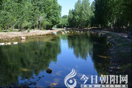 久旱的遼西,卻有著如此清澈透明的水世界。展眼一望,豁然開朗,一池碧水呈現(xiàn)在大家的眼前,讓人意外的驚喜。透過樹影的陽光,零零散散地灑在水面上,反射出星星點點金箔般的閃光。愈往前走,水面愈寬。經(jīng)過若干年的河水沖刷,兩岸的巖石裸露著,層次分明。連綿逶迤的群山,挺拔的楊樹,婀娜的水曲柳,各種各樣的植物,河面上悠閑戲水的白鴨,都映在這沉靜清澈的河水里了。清新秀麗的山水美姿,讓人賞心悅目,心曠神怡。恰似一幅幅令人陶醉的山水畫。