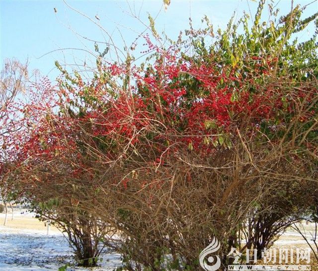 初冬,雪后。茫茫的雪地。營州斜陽石碣的北面,紅色竟一片耀眼。“紅豆”,其實(shí)不是。但每當(dāng)從這里走過,總是不由自主地想到這個(gè)名子。朋友告訴我這叫金銀忍冬。小果圓圓的紅紅的亮亮的,一嘟嚕一串串,一枝挨一枝,連成一片紅。一看到,就油然想起大詩人王維的詩。他明明寫的是“紅豆生南國”,可我們這里是北國,我真感嘆自然物種的相似。