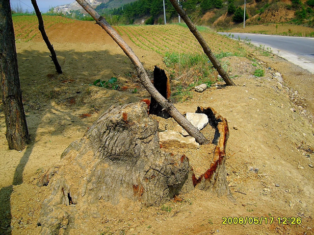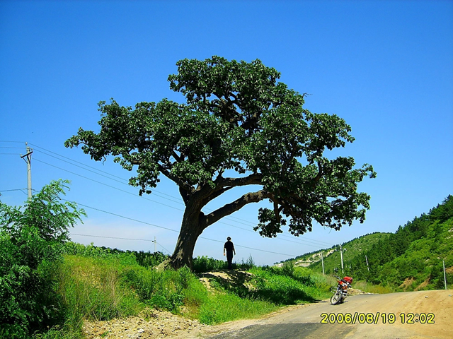 遼寧省凌源市劉杖子鄉(xiāng)廟梁槲樹,位于劉杖子與大河北交界處廟梁上,高11米,冠幅12米,胸徑0.89米,樹齡370年。這棵古槲樹生長在廟梁最高處,樹干不高,呈斜向生長,樹冠很大,層次分明,樹形優(yōu)美,長勢非常茂盛。遠望猶如一個天然盆景。它像一位歷盡滄桑的老者,閱歷三百年朝代的更換,戰(zhàn)火的洗禮,人世間的變幻,以及370多年的風霜雨雪,水旱饑饉,這一切都沒有使它退卻。卻在公元2008年2月6日晚(除夕夜)古樹完成了它370多年的生命輪回,悲哀的消失了。原來當?shù)赜袀€習俗,很多人由于信封迷信,找個大樹認干媽,祈求好運或平安長壽。不少人到這棵古樹下認干媽,給古樹系上紅繩,燒上香紙表等,在風干物燥的冬季,一下子把干媽燒死了,以上兩張照片已經成為絕版。