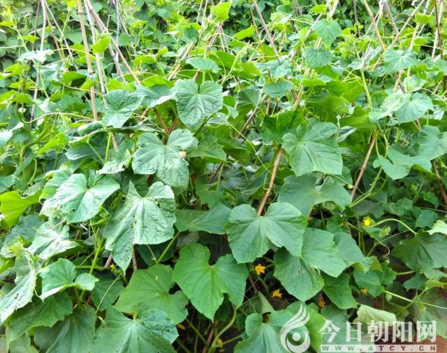 黃瓜架看著比西紅柿架整齊,不知道城里人從哪里弄來這么多的秫秸桿,黃瓜葉碩大而夸張,仍露出點(diǎn)點(diǎn)黃花和彈簧似的藤索,怪不得架子那么漂亮。