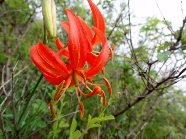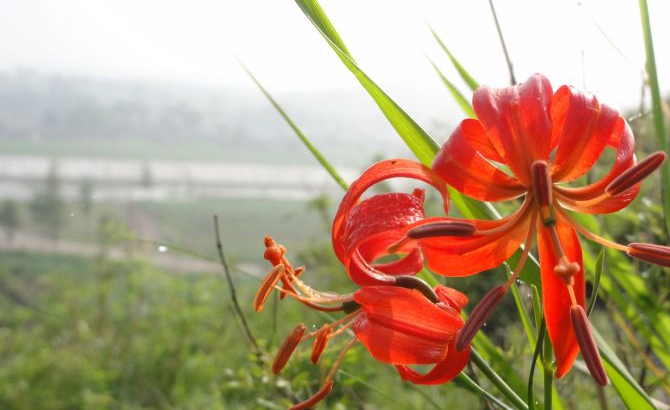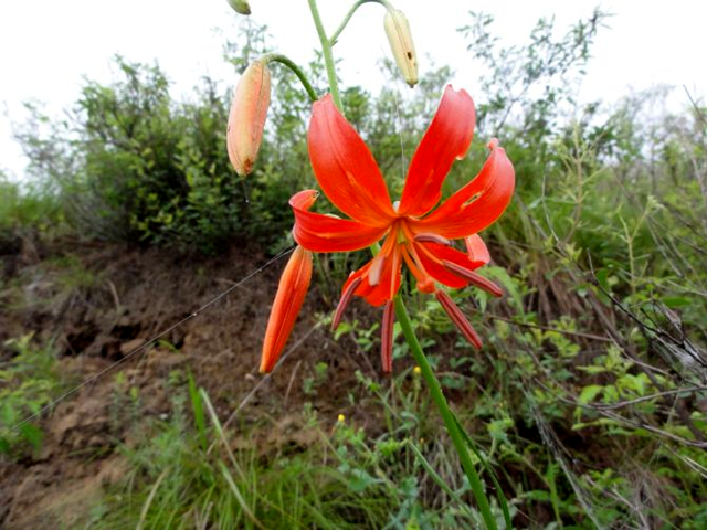 細葉百合的花色呈純正的朱紅色,非常鮮艷,非常大的一片草地,一片山坡,開上那么一棵兩棵的,遠遠就能看見,真正是“紅艷艷”的,招人喜愛。小孩子上山采花,見著散落花,使勁往跟前跑,采上那么一小把,就高興得不得了。