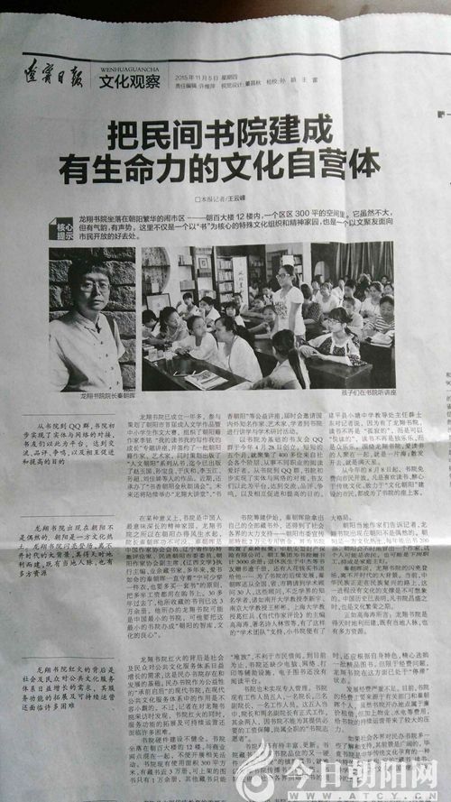 朝陽當(dāng)?shù)刈骷覀兏嬖V記者,龍翔書院出現(xiàn)在朝陽不是偶然的。朝陽是一方文化熱土,每年能出書200部。朝陽會不時地冒出一個作家,這個人可能是農(nóng)民,也可能是下崗職工,抑或是家庭主婦。據(jù)不完全統(tǒng)計,朝陽市城鄉(xiāng)光殘疾人文學(xué)愛好者就達上千人。