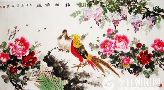 境由心造,天人合一;謳歌時代,彰顯生命。這是劉紅芳創(chuàng)作中所追求的至高藝術境界。她深深懂得,萬物皆有靈,藝術家必須面對大自然,親近大自然,一次次進行心靈修化,完成原生態(tài)畫家從具象到意識的轉化,這樣才能突破傳統(tǒng)花鳥畫中追求一枝一葉的意味,將藝術表現(xiàn)的重心轉向渾然和諧的宇宙自然生命本體,追求一種作品整體上氣、勢、意、韻、神的“大美”,融鑄出自我性靈與宇宙生命相溝通的境界。比如她在人民大會堂創(chuàng)作的《錦繡前程》,這幅畫作雖然是舊命題,但她卻能通過傳統(tǒng)筆墨線條創(chuàng)出新意,通過牡丹、錦雞的物象形態(tài)與筆墨情趣有機交融,并配以水仙、紫藤、蜜蜂等相襯托,營造出一種步移景換,渾然一體的藝術感覺。給人帶來美好喜悅與蓬勃明朗的祥和感。那燦爛的色彩,飛動的線條,靈妙的墨韻,都在大俗大雅的開合之中盡情肆意宣泄。她展示了當代女畫家中從未展示過的“盛世頌歌”的圖解式畫作,其理性精神與直覺感悟,妙合無垠。