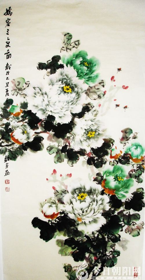 苦把流光換畫禪,功夫深處漸天然。劉紅芳以率直達觀的人生態(tài)度,用極富滲透力的筆墨描繪牡丹靈妙雍容的花型。她筆下的牡丹作品,筆未動意先行,用何種色彩、何種構圖,均由主題而定。她用色考究,清麗不俗,用墨大膽,率真灑脫。在淡雅中彰顯雍容華貴的神韻;在艷麗中突出飄逸雋永。有的似貴妃醉酒、有的似玉顏皎皎、有的奔放熱忱、有的艷麗灑脫、有的蘊涵端莊、有的雍容華貴、有的風姿綽約……畫面上那動與靜、剛與柔、拙與逸、濃與淡、輕與重、繁與簡、疏與密、遠與近、虛與實、似與不似、有限與無限,看似對立的東西,在她的筆下都極其巧妙地統(tǒng)一起來。無論是一花、一葉、一蕊、一芽、一蕾、一蝶,一鳥、一蟲都各有靈性,各有神韻,讓意境平添了無限的詩意。她的早年作品《何人不愛牡丹畫》構圖精美,左右呼應,姹紫嫣紅,蝶飛蜂舞,花瓣花葉層次分明,剛勁的線條、渾圓的墨團,形成凝重又活潑的旋律。給人以萬紫千紅總是春的感覺,絕無艷媚輕浮之氣。賞讀她的畫作,你仿佛置身于春光明媚、花團錦簇的牡丹園,暗香浮動,流連忘返,千姿百態(tài),惹人喜歡。