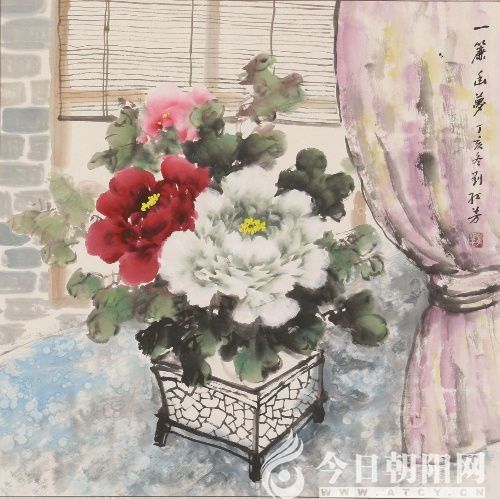 得意忘形,得意忘象。這是劉紅芳創(chuàng)作中的一種常態(tài),一種感覺、一種感情。當筆墨融化到內心,她認為自己畫的已經(jīng)不是筆墨,是在畫情感,是在畫生命。她雖為女性畫家,但畫作卻陽剛,灑脫,有大氣;小品尺幅小,氣度大,感覺是大作品,既有大寫意的筆墨氣派,震撼人心,又有小寫意的造型、筆墨,構圖又極其講究。在劉紅芳的諸多作品中,她的小品斗方堪稱當今女畫家之中難得的上品佳作。這些畫作雖然尺幅小,但意境深。她繼承光大了傳統(tǒng)筆墨情趣,吸收西方繪畫技法,同時又融入禪學意境,使她筆下牡丹更人格化,給人以心靈的震撼,一種強烈的生命本體意識油然而生。如她創(chuàng)作的《紅芳》,表面看是一書一燈一瓶二花三果,家庭布景,實際上是作者借物喻情、借物喻意,這種擬人化手法在她筆下運用自如。這幅作品代表了她自我的一種理想、一種愿望、一種向上進取的精神。再如她的斗方作品《一心為善》,三朵牡丹一盆栽,一本善書教未來,畫面簡潔,禪意深遠;《一簾幽夢》則吸收了西畫技法,國畫技巧,小品大景,透視感極強,又有文人畫的含蓄韻味,令人回味遐想……