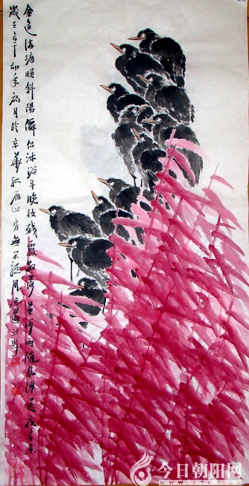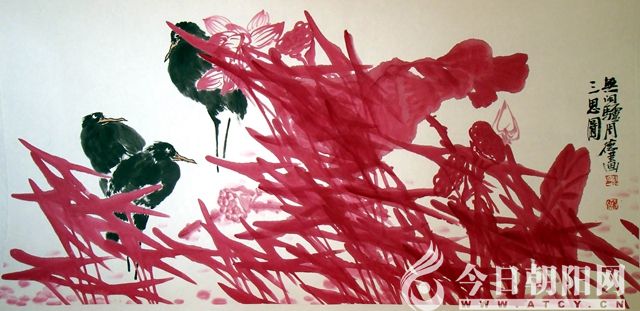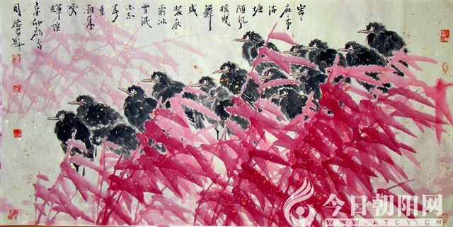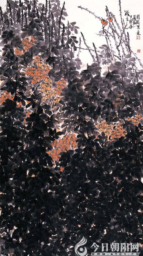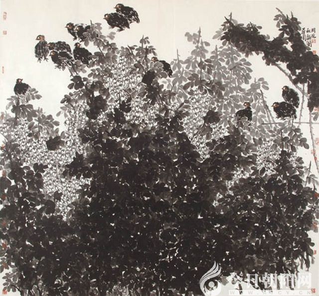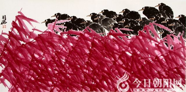 賞析探尋周德花鳥作品的審美情趣,重在剖析他的人文精神。歸納起來有如下三大特點(diǎn)。一是突破傳統(tǒng),走出精而小的瓶頸。周德在最新的作品中摒棄了傳統(tǒng)花鳥畫的一枝一景、一景一格的經(jīng)典構(gòu)圖模式。他把筆墨回歸現(xiàn)實(shí)生活中,直接描寫大自然中的花鳥,葉茂鳥靜,還原自然,恬淡閑適,層次清晰,色澤鮮艷,營造出生機(jī)盎然的藝術(shù)境界。二是在畫面形態(tài)上實(shí)現(xiàn)了質(zhì)的突破。他的作品畫面大方,滿實(shí)不塞。筆下花鳥各得其態(tài),相襯相映,靜中有動(dòng),動(dòng)中有靜,靜動(dòng)相宜。三是繪畫語言的表達(dá)豐富多彩。他的作品大多兼工帶寫,筆墨質(zhì)樸蒼潤,工而不滯,寫而不亂,胸襟澄闊,樸厚儒雅,氣韻生動(dòng)。特別是在鳥兒的神態(tài)刻畫上頗得神韻,雖大抒筆墨,卻不著他色。尤其是色彩的運(yùn)用很有獨(dú)到之處,他繼承和發(fā)揚(yáng)中國畫的色彩傳統(tǒng),同時(shí)吸收西畫重彩優(yōu)點(diǎn),雖然畫面非紅即黑,少有他色,但墨色卻層層渲染,厚重亮麗,潑彩、漬彩、點(diǎn)彩、灑彩等等手法交相輝映,相映成趣,給讀者留下廣闊的聯(lián)想空間和對(duì)自由生活的美妙憧憬。這些原生態(tài)意味的表現(xiàn),傳達(dá)出畫家探究人與自然、人類社會(huì)與生態(tài)環(huán)境統(tǒng)一和諧的新境界。如他的代表作《紅色系列》,這是一組攝人心魂的經(jīng)典力作,墨色厚重沉穩(wěn),紅色層次明晰,鮮艷奪目。畫面以意境鋪陳,以氣勢鋪陳,以靈感鋪陳,通過對(duì)自然的構(gòu)景,抒寫著畫家對(duì)生命的渴望和對(duì)自由和諧的向往。