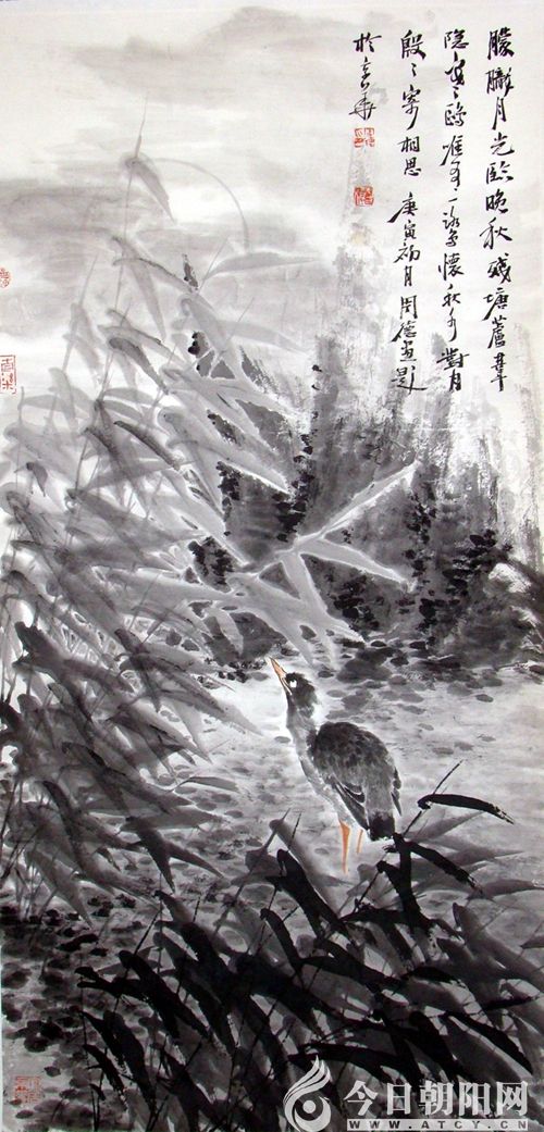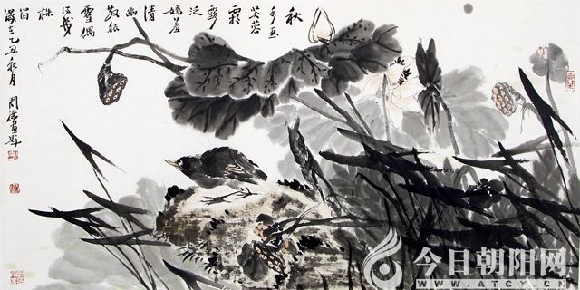 夏天/夢在茂盛的池塘里/內(nèi)心無以言表的喜悅/仿佛還沉浸于昨日的美夢/回憶著已逝的時(shí)光/微風(fēng)拂柳/垂柳的柳絲宛如夢中的帷帳/我那夢的輕紗/一時(shí)的情懷/猶如一曲千古傳送的愛情詩章/也許這是一種情感的依托/也許這是焦躁的安慰/望著那盛開萬點(diǎn)的紅妝/我情愿把夢/深系在那難忘的荷塘。這既是一首詩,又是一幅畫,這是一位丹青才俊用筆墨渲染出的一幅《清塘荷韻》。作者就是曾榮獲2010年度中國最具收藏潛力書畫家稱號(hào)的花鳥畫家周德先生。