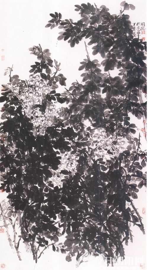 作品是心跡的再現(xiàn),靈魂的吶喊。周德的畫作更多畫的是心境而非物象,是人文而非技巧。他以形寫神,境界深邃,意境開闊,簡括生動(dòng),詩情畫意間風(fēng)行雨散,鳥靜聽音,潤色花開,頗顯心性。墨的濃淡干濕、線的疏密虛實(shí)、色的韻致、筆的節(jié)奏以及書寫性的美感都可以折射出他對(duì)前人筆墨成就的解讀,滲透著他對(duì)繼承和創(chuàng)新的認(rèn)識(shí)與理解。他把扎實(shí)的傳統(tǒng)筆墨功夫融入了新的圖式與新的精神表現(xiàn)之中,打破了傳統(tǒng)圖式、筆墨的局限性,彰顯時(shí)代氣息,形成了自身鮮明的花鳥畫藝術(shù)特點(diǎn)與個(gè)人風(fēng)格。他的《紅色系列》花鳥作品紅的艷麗不俗,熾情熱烈,黑的深沉高雅,溫潤莊重。他的《墨色系列》花鳥作品畫構(gòu)時(shí)代氣息明顯,滿而不充塞,層次豐富而不亂,內(nèi)涵有著極強(qiáng)的文化哲理。同時(shí)也發(fā)揮了自己書法之長,筆墨有著自己的個(gè)性,一改過去創(chuàng)作精微小品之習(xí),大氣作品也呈精微,境界整體把撐已具品位,內(nèi)涵著極強(qiáng)的文化哲理,彰顯畫家在書法上的修養(yǎng)。(哈爾濱師范大學(xué)藝術(shù)學(xué)院院長高卉民語)。