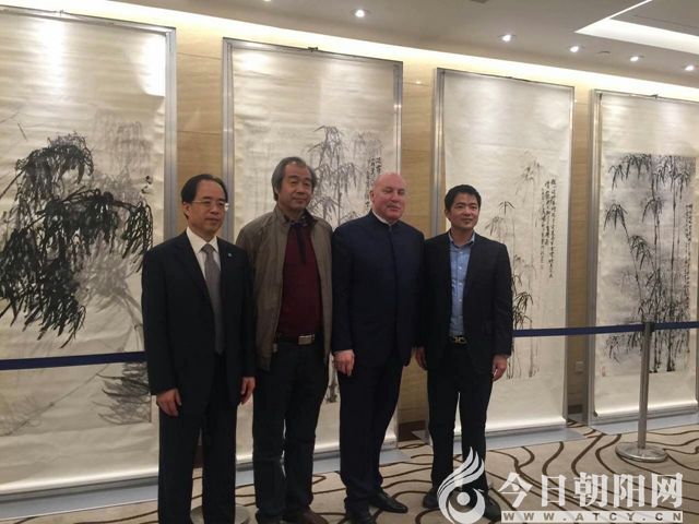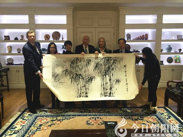 楊竹夫婦與住俄羅斯大使王開文(中)在作品前合影