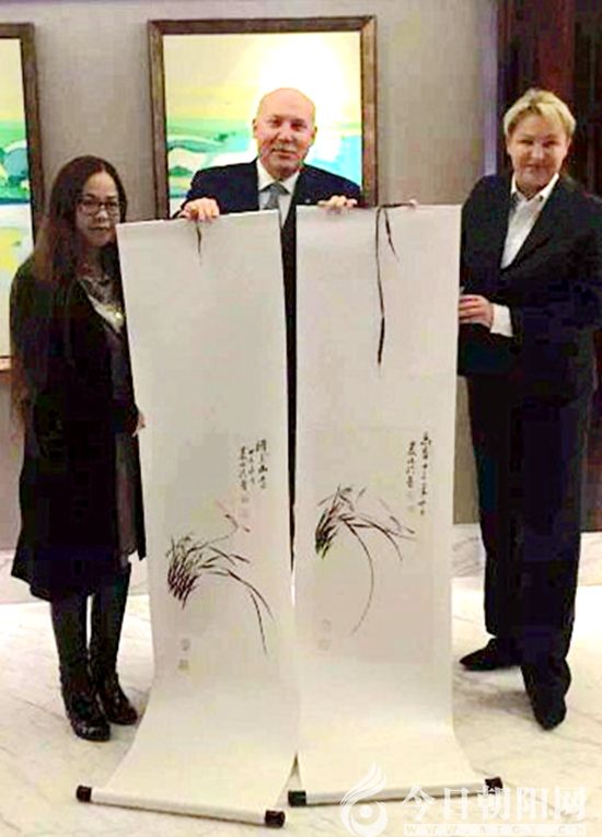 農(nóng)偉珍將兩幅蘭花作品贈送上合組織秘書長梅津采夫(中)