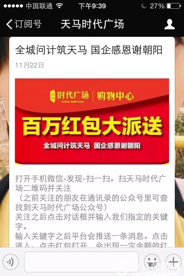 本條信息發(fā)送后,線上發(fā)紅包活動正式開始?。?/span>“發(fā)紅包啦!時代廣場線上搶紅包啦!!”