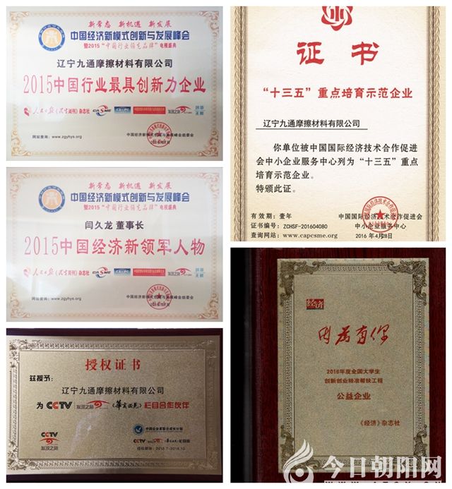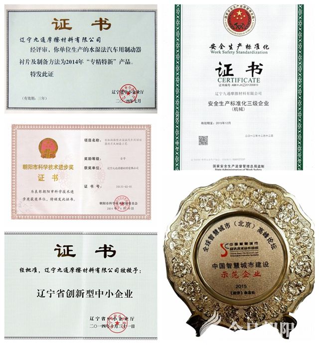 九通已成為中國汽車工業(yè)協(xié)會理事單位、中國汽車工業(yè)協(xié)會制動器分會常務副理事長單位、中國摩擦材料密封材料協(xié)會會員單位、CCTV央視創(chuàng)新千家組成計劃扶持單位、中國經(jīng)濟日報社創(chuàng)新驅(qū)動宣傳入選單位、中國經(jīng)濟新模式創(chuàng)新與發(fā)展峰會2015年入選單位、“十三五”重點培育示范企業(yè),九通公司已列為國家新材料重點儲備項目。