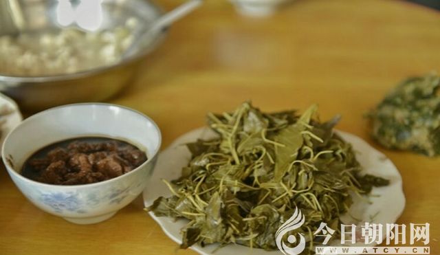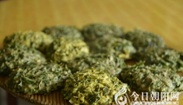 擺上桌的楊樹葉和玉米面做的鍋貼