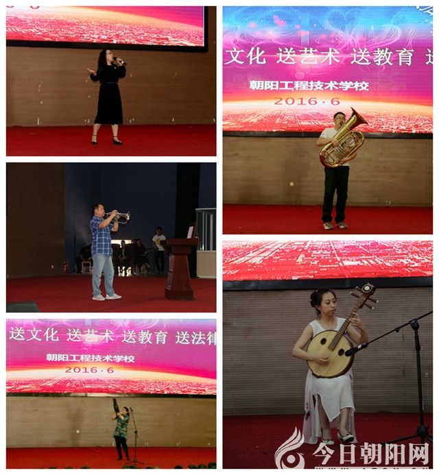 在學校多功能報告廳,來自沈師大的曾慶彪老師根據(jù)學生年齡特點,給同學們上了一堂生動的法律課。隨后,藝術(shù)家們各展其能,笙獨奏、阮獨奏、大號、小號演奏及如天籟般的美聲歌唱,為我校師生帶來一場精彩的藝術(shù)盛宴,報告廳里不時爆發(fā)出熱烈的掌聲。受其感染,工校師生也登臺獻唱,對藝術(shù)家們的到來表示歡迎和感謝。他們純樸的表演和純凈的歌聲讓藝術(shù)家們也贊嘆不已。