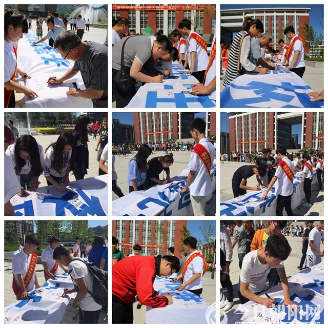 會后,市領導到學校廣場宣傳圖片展區(qū)參觀并在拒絕毒品的條幅上簽名,學校師生也在條幅上簽上了自己的名字。