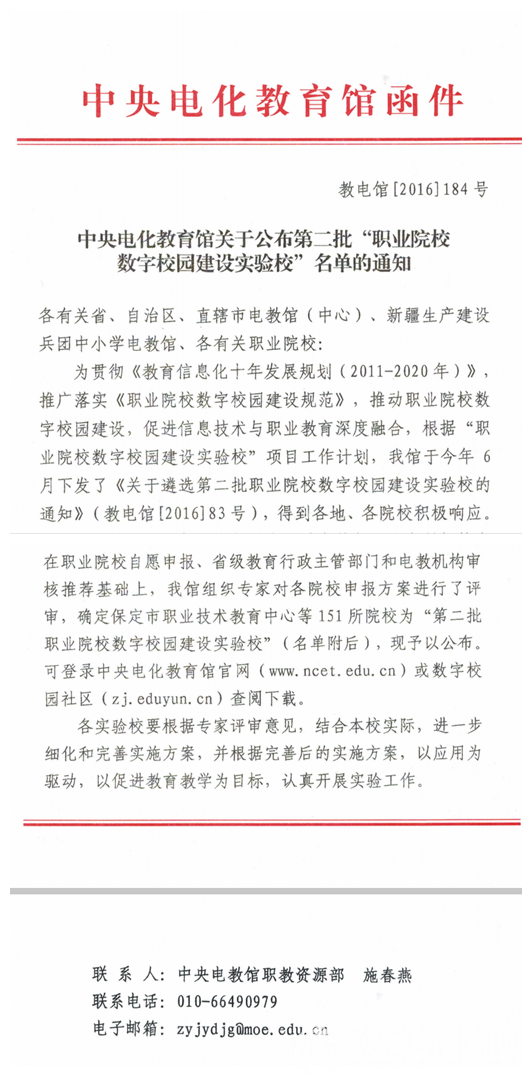 10月初,學校網(wǎng)絡中心把數(shù)字校園實驗校申報書及建設方案上報到中央電化教育館。經(jīng)過中央電化教育館專家組網(wǎng)上考察、方案評審等綜合考評,于2016年11月24日正式通過朝陽工程技術學校為“第二批職業(yè)院校數(shù)字校園建設實驗校”,通知公告于2016年12月1日公布。
