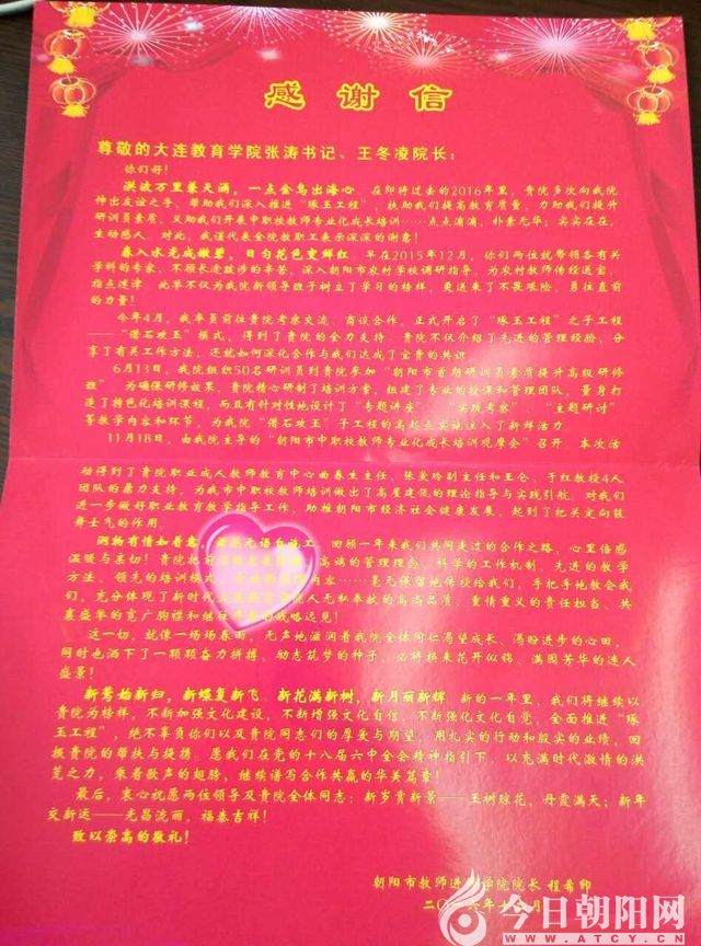 為表感謝、感激之情,朝陽(yáng)市教育(體育)局黨委委員、市教師進(jìn)修學(xué)院院長(zhǎng)程希印,搶在2017年第一縷陽(yáng)光照在教育天空之前,向大連教育學(xué)院發(fā)出了情真意切的《感謝信》。經(jīng)本網(wǎng)爭(zhēng)取、朝陽(yáng)市教師進(jìn)修學(xué)院授權(quán),現(xiàn)將全文鄭重推薦給廣大讀者。