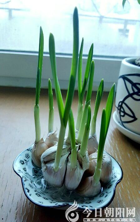 第二天放學(xué)回到家,我放下書包趕緊去看大蒜,大蒜已經(jīng)冒出了綠色的小芽。