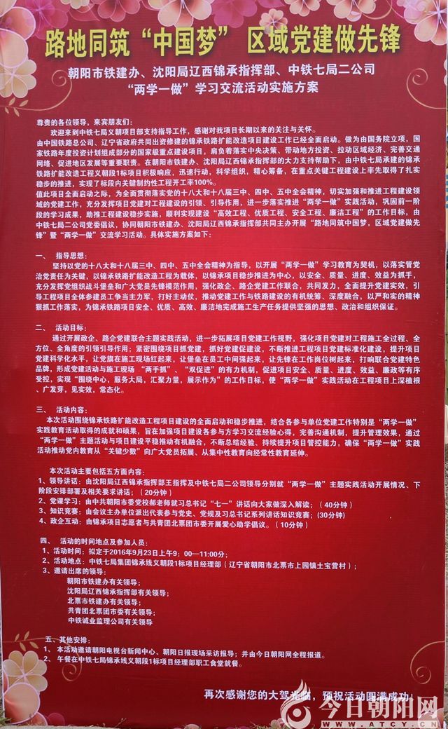 9月23日上午,遼西大丘陵,惠風(fēng)和暢,萬里祥光。一場(chǎng)以“路地同筑‘中國夢(mèng)’,區(qū)域黨建做先鋒”為主題的“兩學(xué)一做”學(xué)習(xí)交流活動(dòng),在位于遼寧省北票市上園鎮(zhèn)土寶營(yíng)村的中鐵七局錦承鐵路擴(kuò)能改建義朝段1標(biāo)項(xiàng)目部隆重舉行。