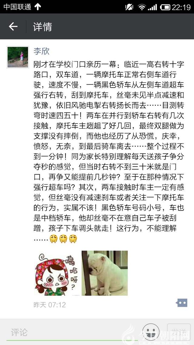 忽然想起曾在微信朋友圈看到微友李欣在“說(shuō)說(shuō)”中記述的一段文字:“剛才在學(xué)校門口親歷一幕:臨近一高右轉(zhuǎn)十字路口,雙車道,一輛摩托車正常右側(cè)車道行駛,速度不慢,一輛黑色轎車從左側(cè)車道超車強(qiáng)行右轉(zhuǎn),刮到摩托車,絲毫未見(jiàn)半點(diǎn)減速和猶豫,依舊風(fēng)馳電掣右轉(zhuǎn)揚(yáng)長(zhǎng)而去……目測(cè)轉(zhuǎn)彎時(shí)速四五十(邁)!兩車在并行到轎車右轉(zhuǎn)有幾次接觸,摩托車主趔趄了好幾回,最終雙腿做為支撐沒(méi)有摔倒,而他也經(jīng)歷了從恐慌、慶幸、憤怒、無(wú)奈,到最后騎車離去……整個(gè)過(guò)程不到一分鐘!同為家長(zhǎng),特別理解每天送孩子爭(zhēng)分奪秒的感覺(jué),但當(dāng)時(shí)右轉(zhuǎn)不到三十米就是門口,再爭(zhēng)又能提前幾秒鐘?至于在那種情況下強(qiáng)行超車嗎?其次,兩車接觸時(shí)車主一定有感覺(jué),但絲毫沒(méi)有減速剎車或者關(guān)注一下摩托車的行為,實(shí)屬不該!黑色轎車號(hào)碼小號(hào),車也是中檔轎車,他卻絲毫不在意自己車子被刮蹭,孩子下車調(diào)頭就走!這行為,不能理解……”