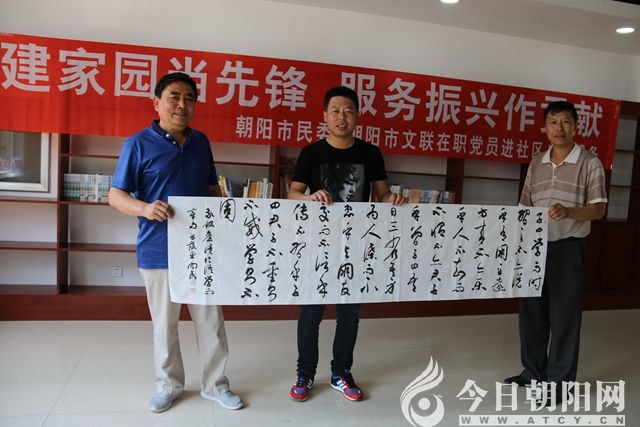 市民委與市文聯(lián)親密攜手,組織30多位黨員干部深入朝陽市凌河街道東風(fēng)社區(qū)孟軻新村中心書屋,組織開展了以“共建家園當(dāng)先鋒·服務(wù)振興作貢獻(xiàn)”為主題的“在職黨員進(jìn)社區(qū)”義務(wù)服務(wù)日活動。市民委主任肖景林,市文聯(lián)主席隋志超帶頭參加了活動。在聽取了東風(fēng)社區(qū)有關(guān)負(fù)責(zé)人的情況介紹后,他們表示將在申請創(chuàng)建民族團(tuán)結(jié)進(jìn)步社區(qū)以及文體活動或設(shè)施建設(shè)等方面給予大力支持。兩家工作人員為東風(fēng)社區(qū)書屋帶來了500多本《遼西文學(xué)》、《中國楹聯(lián)家》、《作家天地》以及本市作家作品集,還為該社區(qū)的4戶貧困戶(其中1戶為老黨員)發(fā)放了價值1200多元的米面油。隨后,市文聯(lián)秘書長、市書法家協(xié)會副主席宋曉珂等4位書法家為社區(qū)和圖書室義務(wù)撰寫了書法作品40余幅。