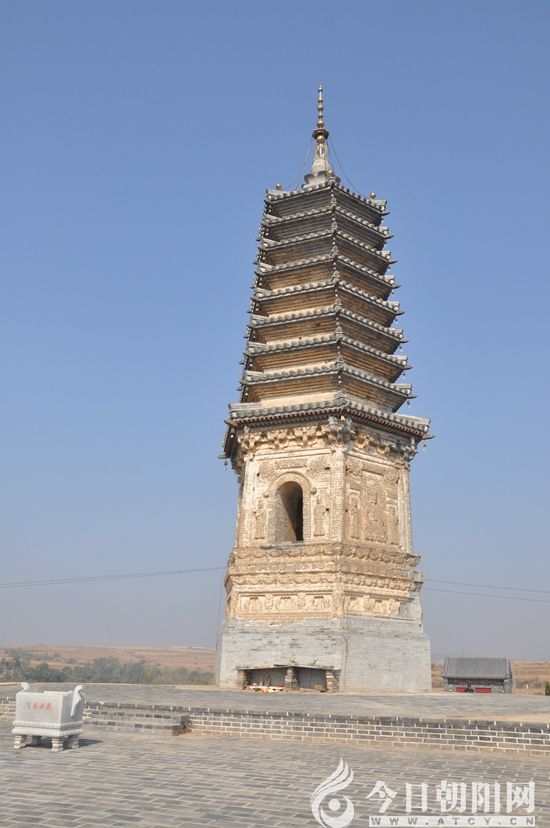 八棱觀塔位于大平房鎮(zhèn)八棱觀村塔營(yíng)子屯北山頂部,呈八角十三級(jí)密檐式,高29.43米,與遼代建州城址隔河相望。塔體結(jié)構(gòu)精巧,以斗拱承托塔檐,中間以一方形十三層密檐小塔相隔,各層束腰上下均雕刻著仰覆蓮花和連球紋圖案,磚雕的人物,或手舉幡蓋,或托摩尼寶珠,或手持凈瓶,或彈奏樂(lè)器,千姿百態(tài),惟妙惟肖,是佛塔雕刻藝術(shù)的杰作。須彌座角柱雕刻一金剛力士,作雙手用力托舉之狀,須彌座上刻有四層蓮花瓣,捧托著雕有坐佛的塔身。塔身每面中央都有高浮雕坐佛一尊,共八尊坐佛,有頭光、身光。此塔所雕佛像與眾不同,身著甲衣,頭戴笄冠,圓臉挺胸,似古代北方少數(shù)民族武士形象,真實(shí)地再現(xiàn)了遼代佛教造像藝術(shù)民族化的特點(diǎn),在全國(guó)僅存的80多座遼代古塔中堪稱(chēng)一絕。據(jù)專(zhuān)家分析,該塔建于遼代中期遼圣宗遷建州之前,山腰處建有寺廟,為塔寺合一的建筑格局。
