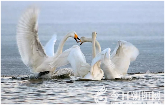 我特別喜歡攝影師(杜福生)的這張照片,動(dòng)感強(qiáng)烈,天鵝飛翔著舞蹈著,寬大的翅膀扇動(dòng)著,畫(huà)出一道道潔白的弧線,與波光粼粼的水色融為一體,潔白的天鵝恰似水中仙子,美極了。