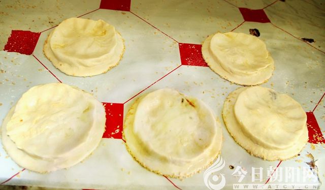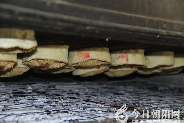 烤制過程中的燒餅,點(diǎn)紅點(diǎn)的帶糖的,不點(diǎn)紅點(diǎn)的是無糖。