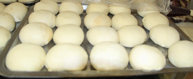 凌源的燒餅是純手式制作,選用最好的小麥面粉加水、鹽、堿,揉好后放在一處醒面,再醒再揉,經(jīng)四到五遍工序后,搟成大張面皮,抹上一層豆油酥,再卷成10厘米粗細(xì)的長條形面卷,再揪成110克標(biāo)準(zhǔn)的面劑。