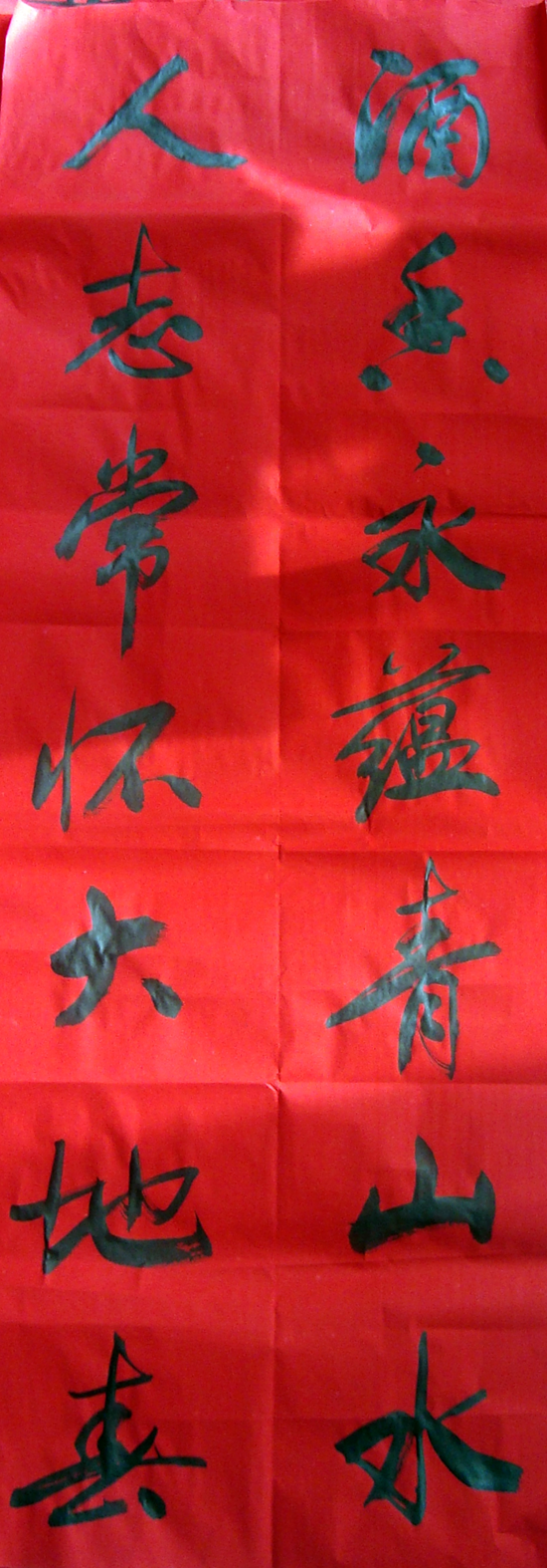 楊先生書(shū)寫(xiě)的“福”字,筆力遒勁,似得書(shū)圣王羲之真?zhèn)?;辛向民?shū)寫(xiě)了筆者所撰對(duì)聯(lián):“山清水秀流玉液,人壽年豐飲瓊漿”;“酒香永蘊(yùn)青山水,人志常懷大地春”。劉喜鵬作為本市書(shū)法界的后起之秀,表現(xiàn)相當(dāng)出彩。但見(jiàn)他懸肘寫(xiě)意,揮灑自如。我早就在尚志紅軍學(xué)校欣賞過(guò)他寫(xiě)的對(duì)聯(lián),也看過(guò)他的幾次書(shū)法展出,深有“江山代有才人出”之感。