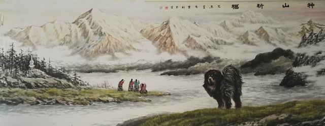 王貴邱在創(chuàng)作追求以儒學(xué)入禪,追求虛實(shí)相生,陰陽(yáng)互動(dòng),中庸和諧,民族團(tuán)結(jié)。他的作品《神山祈?!啡轿辉佻F(xiàn)了他創(chuàng)作的哲學(xué)思想和美學(xué)理念,其藝術(shù)視覺(jué)吸收了宗教圖騰崇拜審美和大眾化、民族化的務(wù)實(shí)審美,探索出了大型犬科、貓科動(dòng)物題材新的繪畫(huà)方向。無(wú)疑,這種探索是有前瞻性和開(kāi)拓性的。這幅作品尺幅宏大,主題突出,題材廣泛,藏獒、雪山、河流、虔誠(chéng)的朝圣者。面對(duì)雪山,朝圣藏民三叩九拜;冰河對(duì)岸,一只成年藏獒回眸守護(hù),這是畫(huà)面的焦點(diǎn),靜靜的冰河流向遠(yuǎn)方。雪山下青草綠樹(shù)相襯,悠悠古剎若隱若現(xiàn),山水、人物、花鳥(niǎo)在同一幅作品中相托相生,色調(diào)和諧舒雅,多而不雜。蒼茫的雪山更為畫(huà)面增添了神秘的色彩,用干筆對(duì)雪山進(jìn)行反復(fù)皴擦,使作品更具有靈性,脫凡超俗。他用畫(huà)筆再現(xiàn)了高原民族的信仰和對(duì)幸福的渴望,表達(dá)了畫(huà)家對(duì)這方土地的摯愛(ài)以及這塊土地上悠久燦爛的文化。
