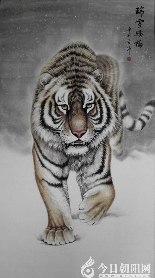再如《巨無(wú)霸》這幅作品,藏獒體態(tài)墩厚,四蹄粗壯,憨態(tài)可掬。特別是黑色的絲毛層次分明。而《瑞雪賜福》這幅工筆虎溫順慈善,絲毛細(xì)膩,造型生動(dòng),背景簡(jiǎn)潔明了,讓讀者走進(jìn)了祥和幸福、財(cái)運(yùn)亨通的吉祥文化之中。仔細(xì)品讀這兩幅工筆畫(huà)作,其背景及其簡(jiǎn)約,獨(dú)獒獨(dú)虎,但神態(tài)刻畫(huà)卻細(xì)膩逼真,其寫(xiě)實(shí)技法難度已經(jīng)超越他繪畫(huà)年齡的時(shí)空。觀其作品,你仿佛歷經(jīng)滌蕩心靈的神圣之旅,置身與原始,蒼涼,粗獷,浩大的雪域高原,再現(xiàn)藏獒的王者風(fēng)范。