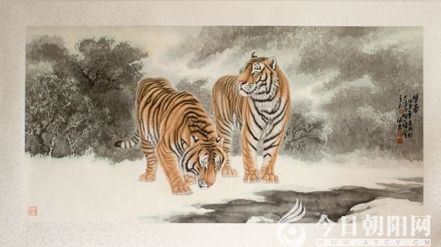 筆墨氣韻是國畫家在創(chuàng)作中追求的最高境界,情感的表達(dá)是當(dāng)前藝術(shù)家的瓶頸,也是匠氣與雅氣的分水嶺。南齊謝赫在《畫品》中提出“六論”,把氣韻生動(dòng)和骨法用筆放在了前兩位,足見筆韻在作品中的重要性。伊海軍深諳此理,他認(rèn)為,真正的藝術(shù)是通往永恒的,是人性的真情表達(dá),是心理需求,是比學(xué)術(shù)更重要的本質(zhì)。他同時(shí)強(qiáng)調(diào),國畫作品不能僅僅停留在技術(shù)層面上,更不能在原地兜圈子,翻花樣,必須在人文關(guān)懷,情感表達(dá)上實(shí)現(xiàn)自我突破,去撥動(dòng)讀者內(nèi)心深處的和弦,這樣才能去掉作品的俗氣和匠氣,不斷提升筆墨意蘊(yùn)的品味與格調(diào)?!对绱骸肥且梁\姸巫兎ê蟮慕?jīng)典代表作品。輕盈超逸,意境深遠(yuǎn)構(gòu)成這幅作品最大的亮點(diǎn)。畫家采用擬人的手法,以虎喻人,一對含情脈脈的情侶在茫茫的原野上迎接早春的訊息。畫面上一只老虎低頭飲水,另一只老虎凝視遠(yuǎn)方,一動(dòng)一靜形成鮮明對比,而兩只老虎的刻畫精細(xì)唯美,工而不匠,神態(tài)自然,內(nèi)斂含蓄,氣韻神通。其背景采取潑墨大寫意的筆法,在材料構(gòu)成上注入現(xiàn)代元素,簡約朦朧,灑脫詩意,明顯得到過當(dāng)代著名畫家宋雨桂潑墨山水畫筆意。一工一寫,虛實(shí)相映。伊海軍用手中的畫筆謳歌了大自然的永恒,生命的珍重。讓讀者不禁贊嘆:這是一片純凈無塵的田野,這是一塊歡樂和諧的家園。